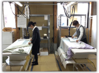 「感じる」仕上げをテーマに、工場を公開しております。目で見る見せる仕上げ、本物を追求する職人の技、 アイロン仕上げ、普段は見ることの出来ないシミ抜き・色掛の作業をご覧いただくことも出来ます。